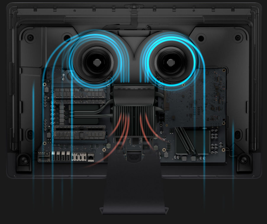 Высокая производительность требует большой мощности. А мощность приводит к нагреванию. Поэтому была полностью пересмотрена архитектура системы охлаждения iMac Pro, добавив в неё инновационный сдвоенный вентилятор, радиатор большой площади и дополнительные вентиляционные отверстия. Результат? Воздушный поток увеличился почти на 75%, а теплоёмкость системы возросла на 80%. Поэтому iMac Pro не нагревается даже при мощности 500 Вт — это на 67% больше, чем у предыдущих моделей iMac.