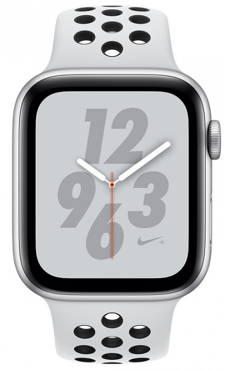 Apple Watch Nike+ Series 4, 44 мм, корпус из алюминия серебристого цвета, спортивный ремешок Nike цвета «чистая платина/чёрный» (MU6K2)