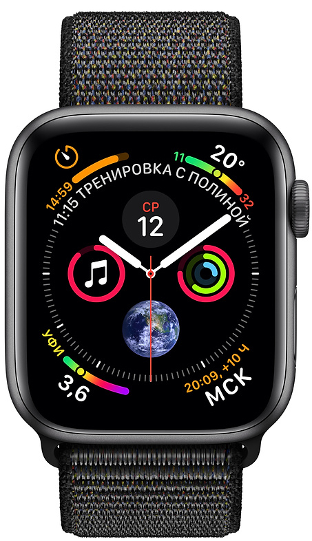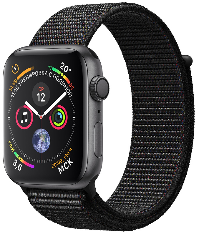 Apple Watch Series 4, 44 мм, корпус из алюминия цвета «серый космос», спортивный браслет чёрного цвета (MU6E2)