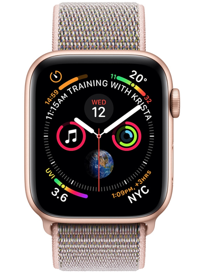 Apple Watch Series 4, 44 мм, корпус из алюминия золотого цвета, спортивный браслет цвета «розовый песок» (MTVX2)